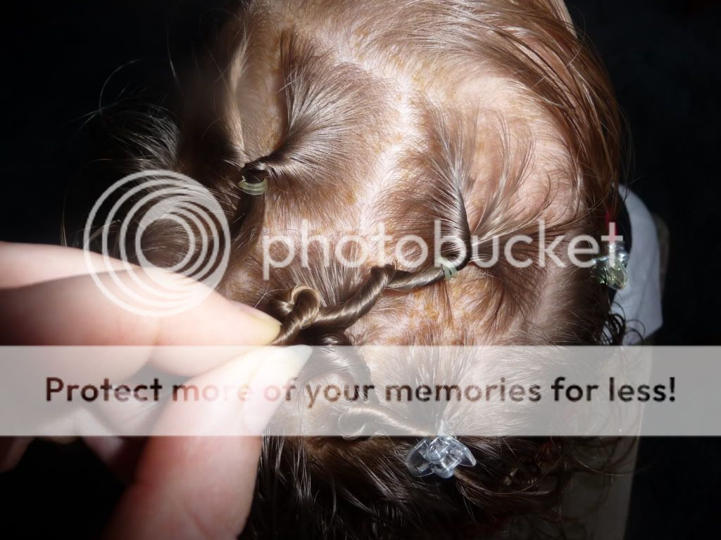 I did go back and put in some little elastics under the claw clips because she just didn't have enough hair to hold it tight. And in retrospect, next time I probably won't bother with the pull-through's for her hair, it would look just as cute without them (almost) and they are time-consuming on a little one with a short attention span! :)
