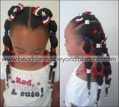 - I used Bee Mine Curly Butter to smooth her edges down and to smooth each ponytail down, then I used Faded Glory Ponytail Holders to band each section, alternating the colors, red, white and blue. I braided the ends down and added some red, white and blue beads, with one white star bead on each braid. I also added last years Gymboree 4th of July bows to the front and back ponies.